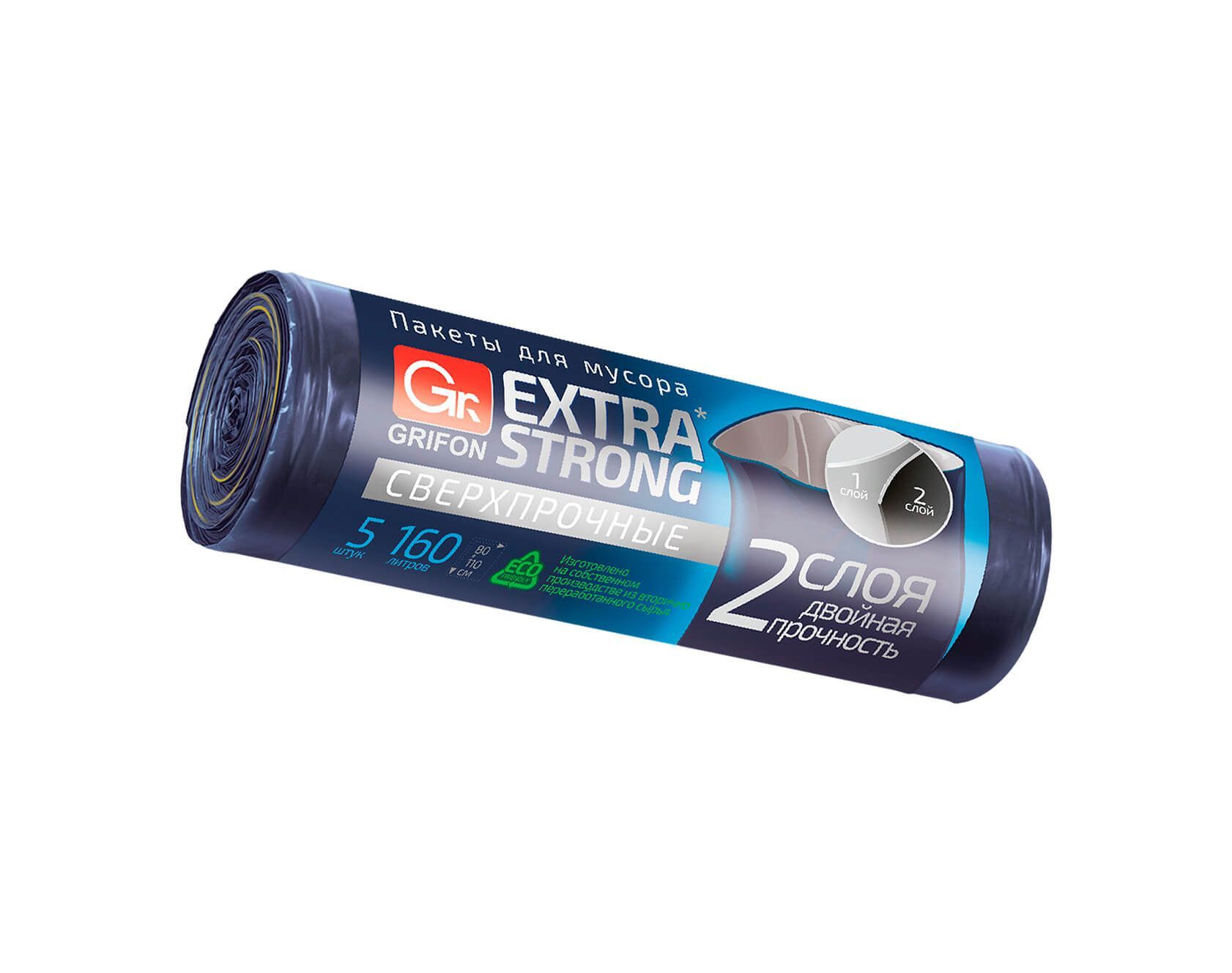 Мешки для мусора 160 л, двухслойные, синие, в рулоне 5 шт., ПВД, 45 мкм, 1100х800 мм, GRIFON EXTRA STRONG, 101-077