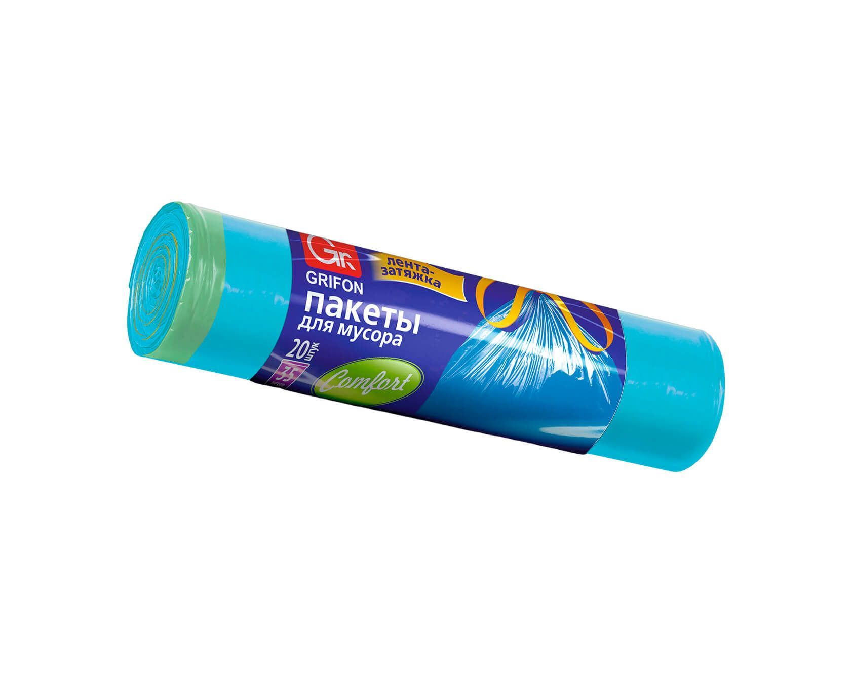 Мешки для мусора 35 л, с завязками, голубые, в рулоне 20 шт., ПНД, 12 мкм, 560х530 мм, GRIFON, 101-061